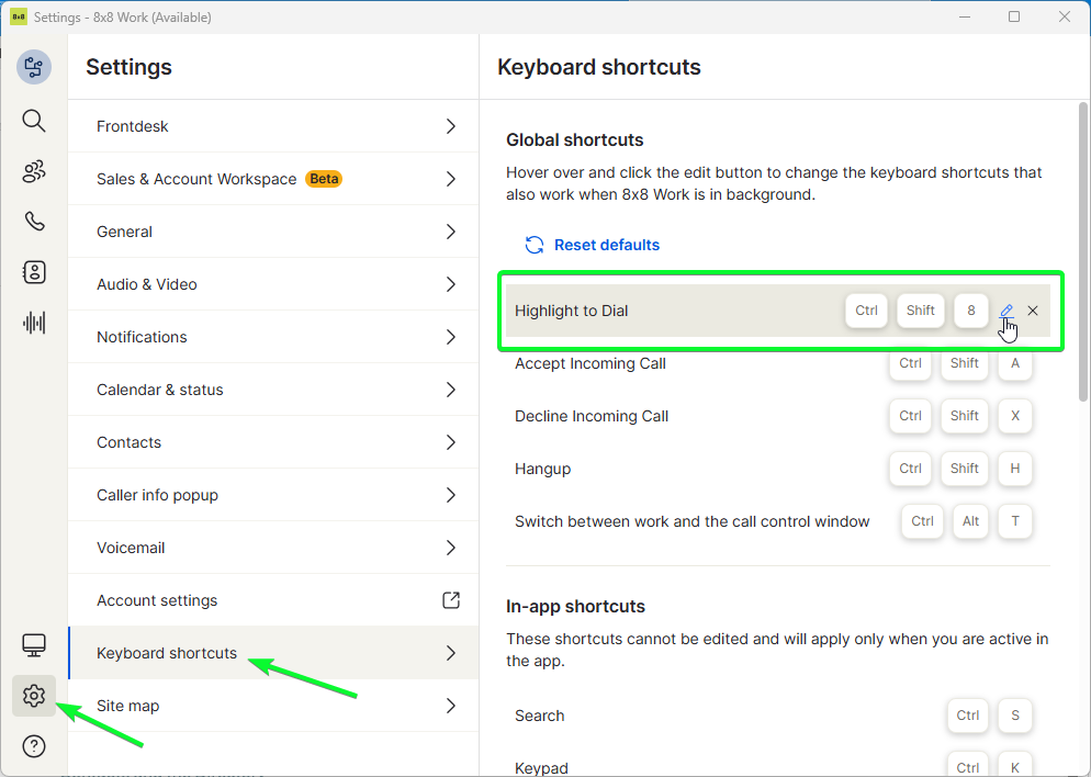 By default click to dial will run out of the box using a keyboard shortcut of CTRL-SHIFT-8. To customise the shortcut go into Settings > Keyboard Shortcuts and find the top option "highlight to dial"